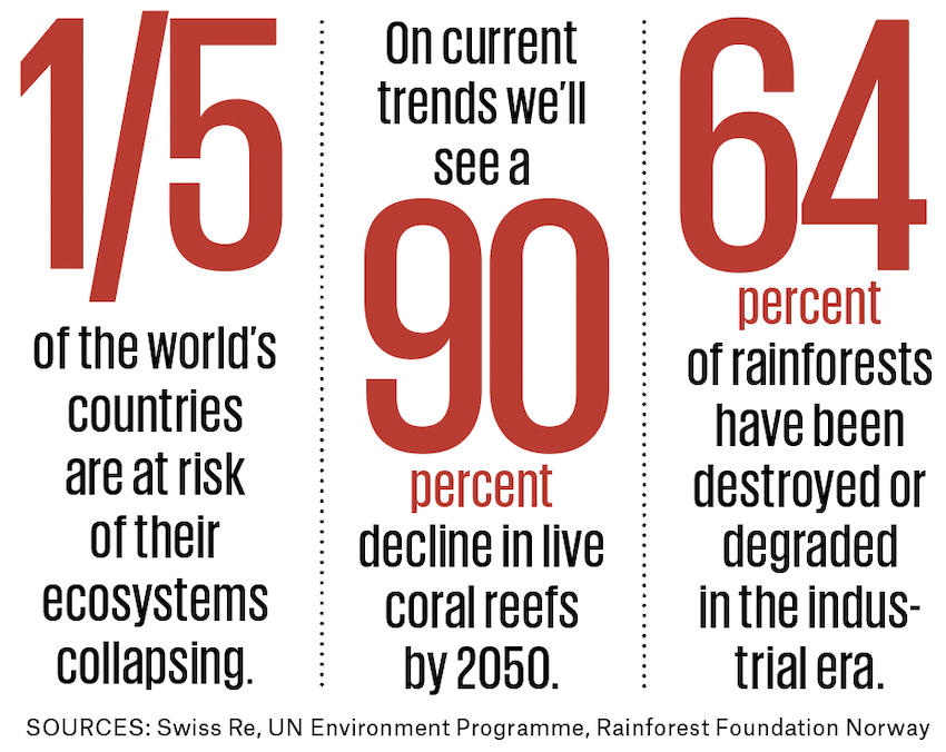 Distressingly, our life support system— nature—is on track to follow a similar pattern of collapse. Our oceans and forests; the manifold animals, plants and the complex ecosystems they create: All are approaching breaking point.