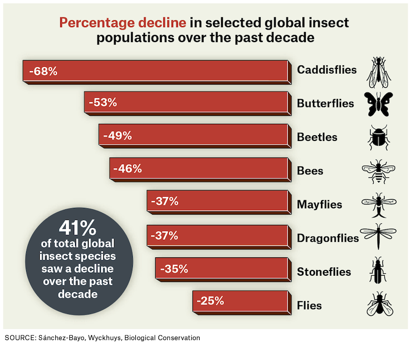- More than 40% of insect species are declining and a third are endangered.