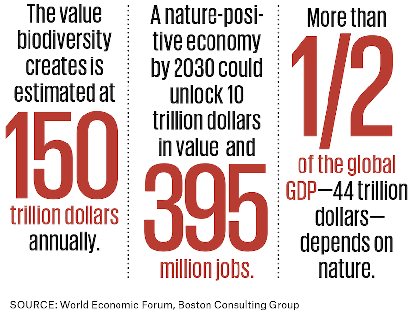 The spotlight is on four key industries: food, energy, infrastructure and fashion. Together they currently drive 90% of biodiversity loss. Many business leaders are realizing that the thriving companies of tomorrow will be those who move now and innovate to protect and restore the natural systems that underpin their long-term resilience and our existence.