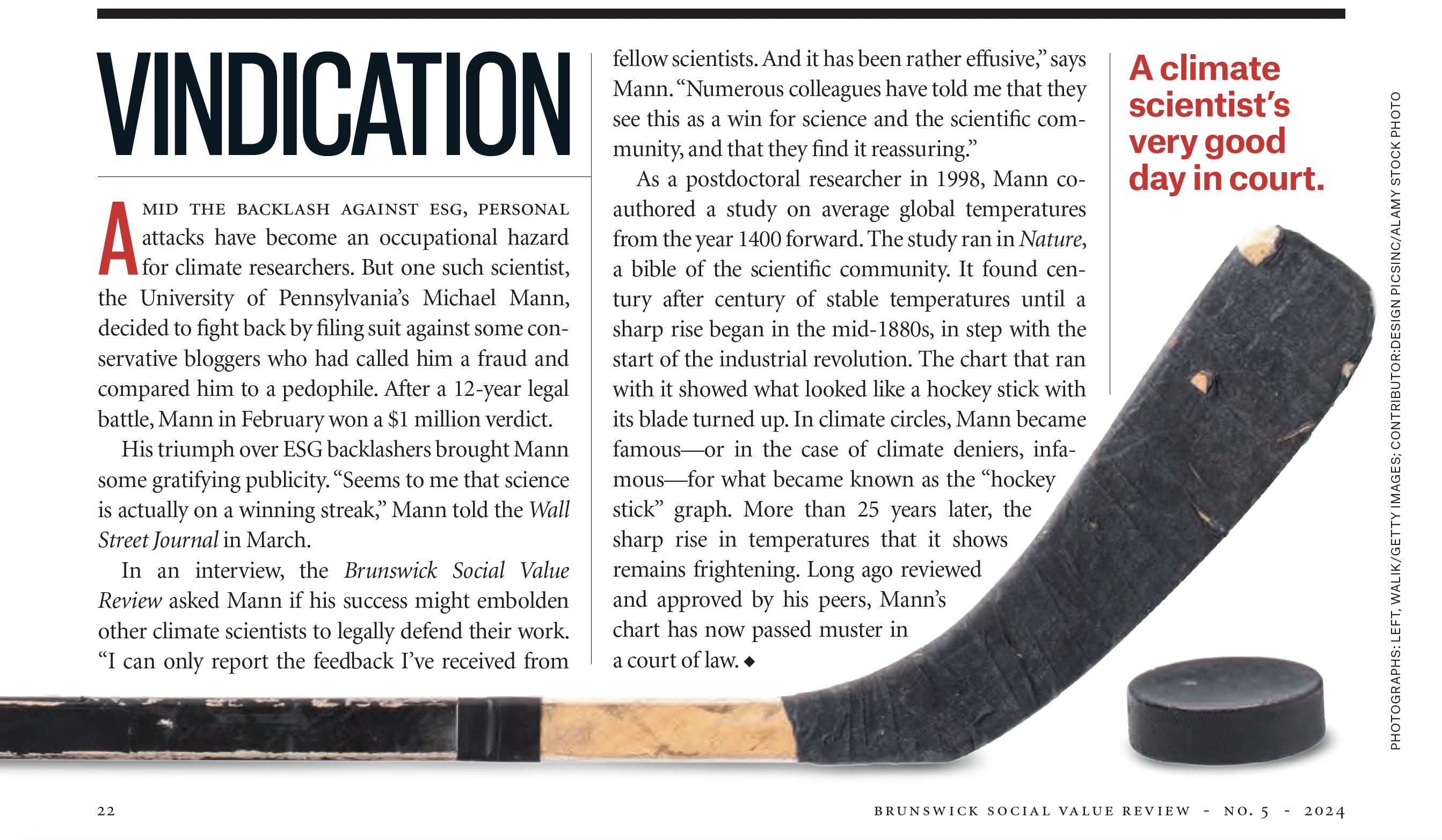 In an interview, the Brunswick Social Value Review asked Mann if his success might embolden other climate scientists to legally defend their work. “I can only report the feedback I’ve received from fellow scientists. And it has been rather effusive,” says Mann. “Numerous colleagues have told me that they see this as a win for science and the scientific community, and that they find it reassuring.”