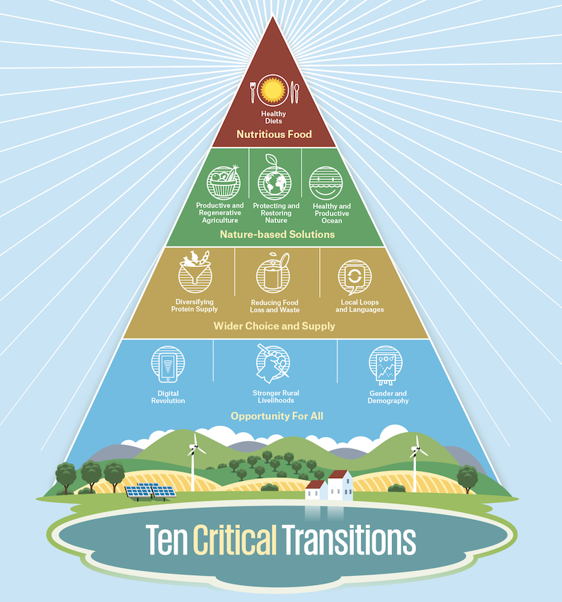 In that report, we outline 10 critical transitions, articulated in terms of kind of an apex of a pyramid. At the top are healthy and nutritious diets. We really believe people need to be put first, both people consuming food, but also people producing the food. It also means people can afford the food that they need to buy and have access to fresh fruits and vegetables, to an increasingly plant-based diet, but where they need access to dairy or meat products, they have it.