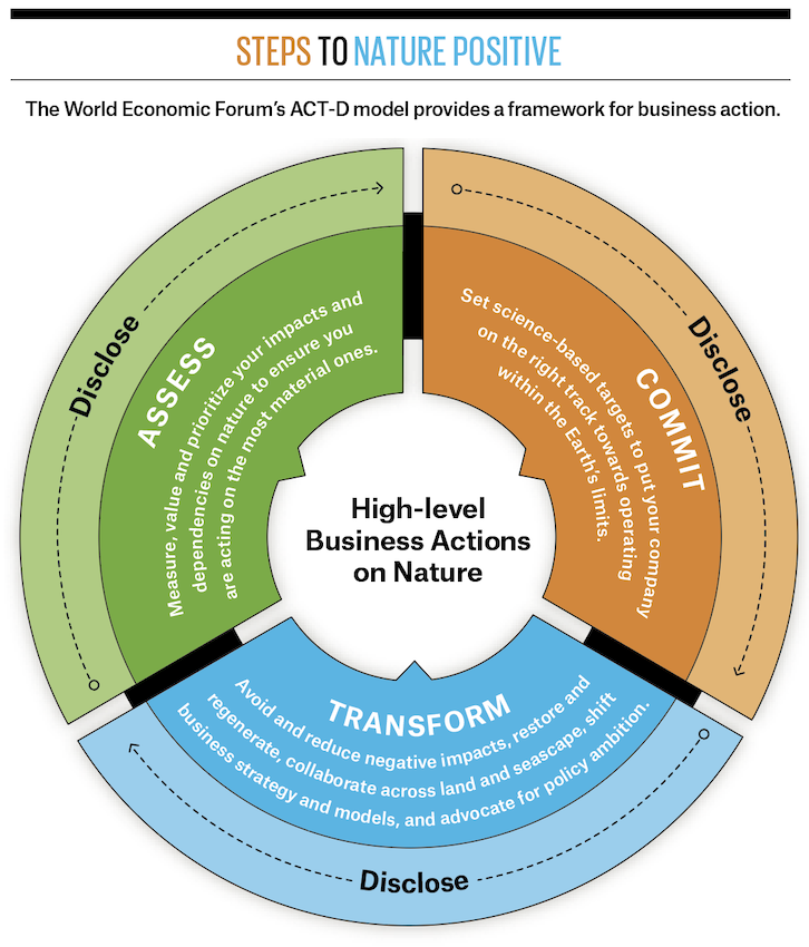 As action mounts, a deep pool of guidance and expertise is emerging on how to implement both net-zero and nature-positive transitions. The level of detail is important but sometimes the volume of guidance can feel overwhelming for companies, and at times even be conflicting. That’s why it’s critically important that a range of groups such as Business for Nature, Science Based Targets Network (SBTN), and the World Business Council for Sustainable Development have come together to create a joint, easy-to-understand framework which presents the high-level steps a business needs to take. It’s called ACT-D, or Assess, Commit, Transform, Disclose.